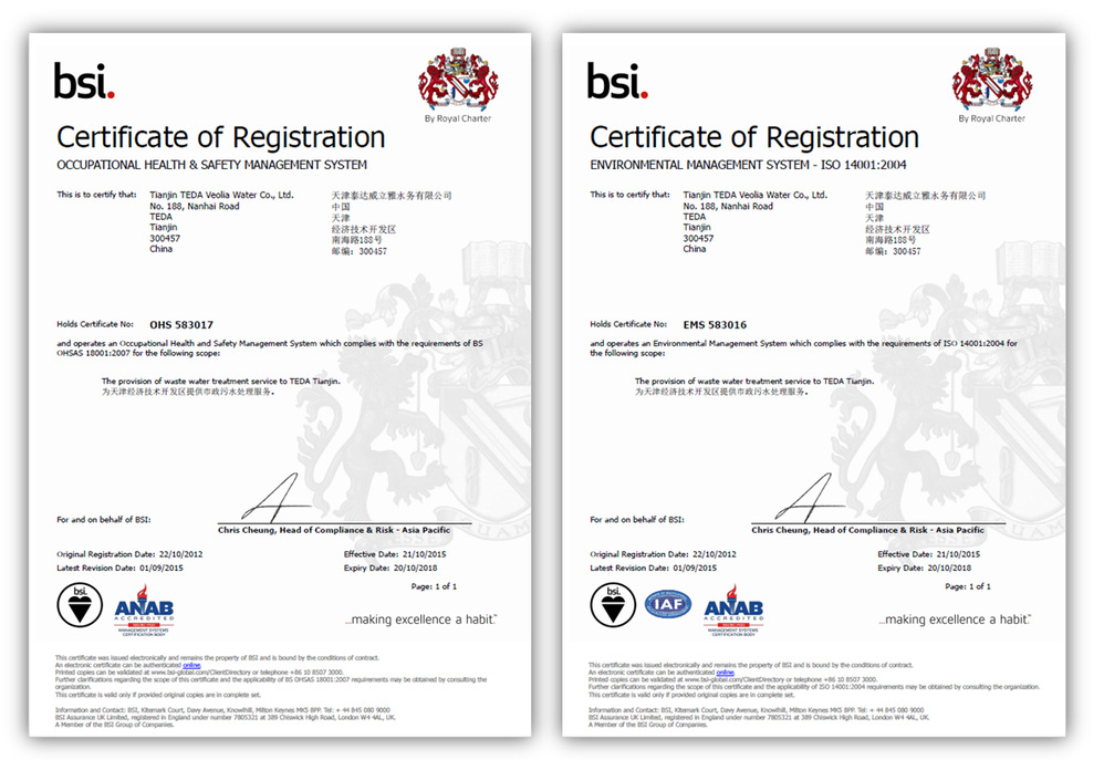 2012年公司獲得BSI公司頒發(fā)的ISO 14001和OHSAS 18001體系認(rèn)證證書,保持著ISO 14001與OHSAS 18001體系的穩(wěn)定運(yùn)行。